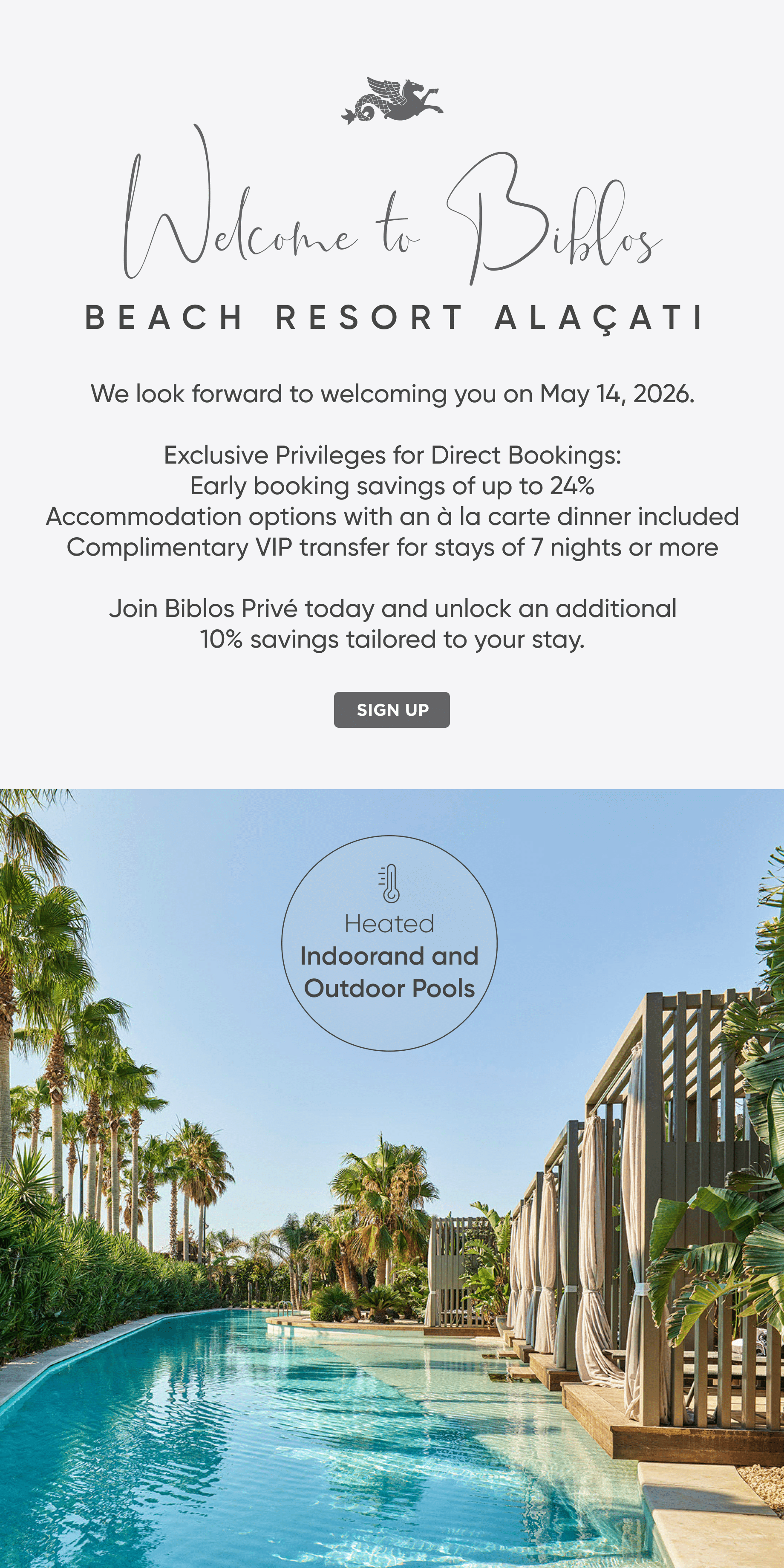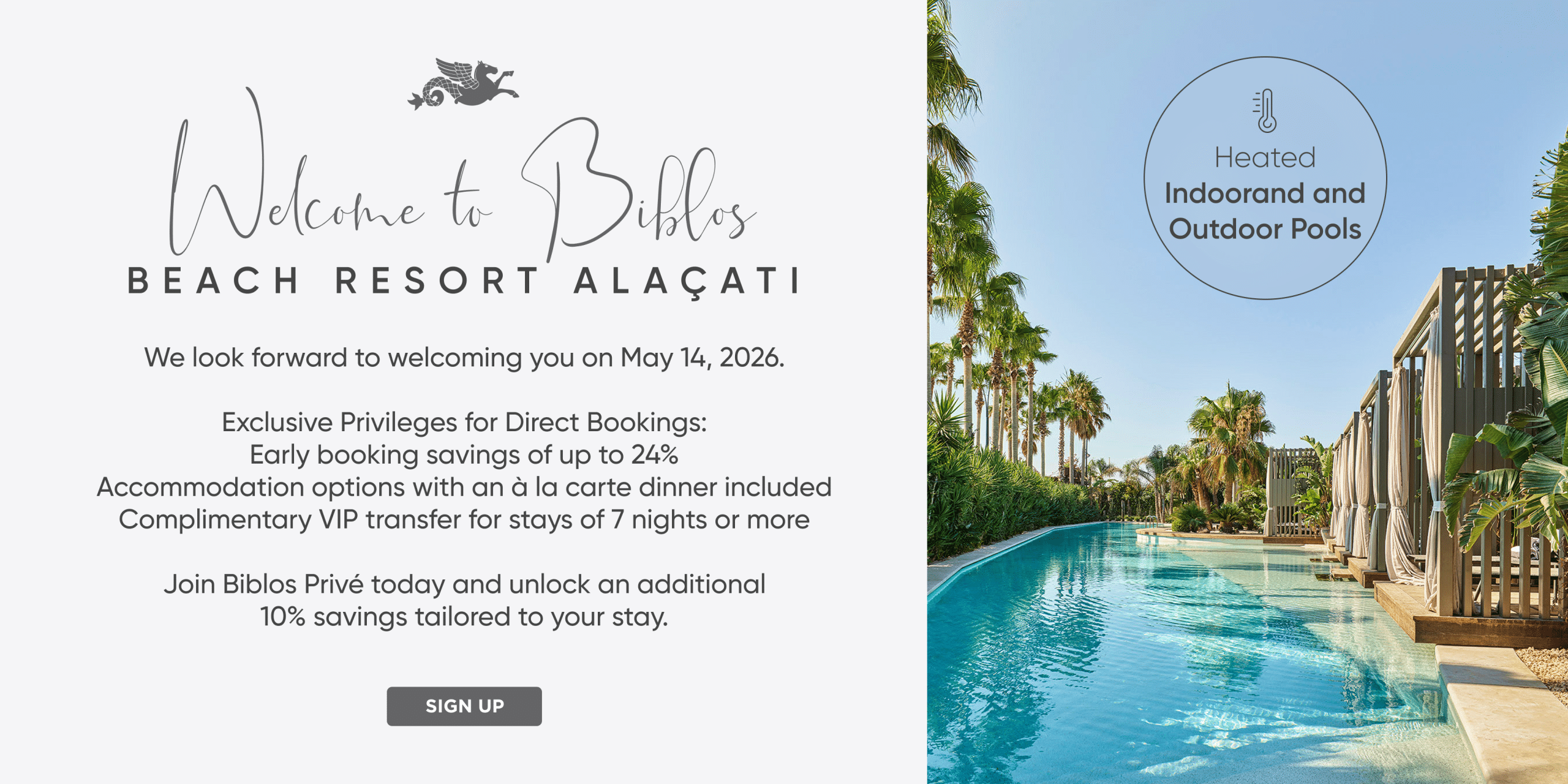 Nestled in the exquisite natural beauty of the Aegean, and the cultural riches of Alaçatı, discover a matchless, heavenly world of outstanding style and flawless service. Biblos, redefines the way you experience life, with moments exceptionally tailored to you from the minute you book, to the day each one becomes an